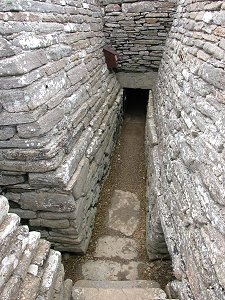 The reconstructed entrance leaves the outer 5.5m as a deepening stone lined trench, and unroofed, leaving visitors to revert to their hands and knees for a muddy crawl only for the inner 3.5m. Crawling through the full 9m of the original tunnel would not have been recommended for claustrophobics!