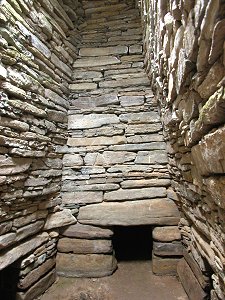 Quoyness was built on an irregular stony platform some 20m across close to the shore of Els Ness. The platform was built as a sandwich of flat slabs containing a filling of stone, earth and midden.