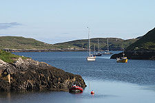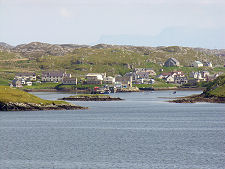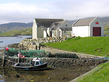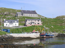 Scalpay's main settlement surrounds its North Harbour, the south side of which provides some superb views across the harbour and the village, many taking in the grey rock of mountainous North Harris rising steeply in the background. The harbour is a busy, bustling place and the village reflects the relative prosperity of the island. Since the photographs on this feature were taken a new pontoon has ben installed in the harbour, providing improved landing facilities for waterborne visitors.