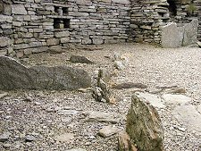 Within the broch are the slight remains of fixtures and fittings like those seen at somewhere like Gurness, plus storage compartments built into the wall. The centre of the broch has a modern metal grille covering a hole in the ground that might have been a well, but which also bears a close resemblance to the steps leading down into Mine Howe on Mainland. In the entrance passage a low passage leads off to one side into a cavity within the wall that offers a fine corbelled roof, interestingly also very reminiscent of workmanship at Mine Howe.