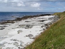 From Balfour, Shapinsay's south coast runs east to the sandy Bay of Sandgarth and nearby Haco's Ness. En route it passes the Old Church and Kirkyard, which houses the burial ground of the Balfours. The first church was built here in 1559, the more recent, now also disused, was built in 1802. The current church is located a little inland.