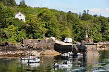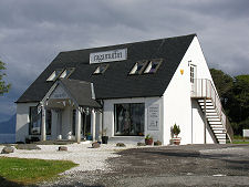 For those spending a little time here, it is worth knowing about "The Shed". This tiny cafe close to the landward end of the pier offers a surprisingly wide range of good food and drink: plus excellent ice creams. Less immediate needs are catered for by Ragamuffin, a clothes and gift shop on the shore near the terminal, and by the Bay Pottery. Nearby is Skyelark, selling a range of arts, crafts and gifts. Skyelark is also home to grumpygeorge photography, offering superb landscapes printed on canvas. Passing the nearby junction with the side road to Ardvasar brings you to Armadale's community run petrol station, also home to the Tourist Information Centre, while nearby is a fairly small housing development.
