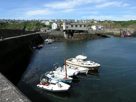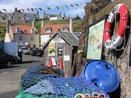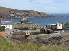 The lower village is overlooked from the cliffs by lines of what were originally fishermen's cottages running parallel to the cliff edge, rounded off to the south by the attractive white-harled Castle Rock Guest House. The other end of the upper part of the village concludes with the church and a large stone mansion enjoying superb clifftop views.