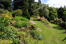 To the east of The Shawl, and at a slightly lower level, is the Low Sand Garden, originally established as a flower garden in about 1700, and re-established in 1829. The yew trees along its northern side are among the oldest anywhere in the gardens. South of The Shawl and the Low Sand Garden the ground descends towards the Marr Water to what is known as the Low Ground. This started life at the end of the 1600s as a series of yew-hedged walks, but was later grassed over. Today the grass is mown decoratively, but the main interest is at the margin of the area, where beautiful planting and a rock garden descend to the river.