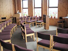 At the far corner of the church is its main focus, a communion table with a cross hanging from the wall above. The table, and the lectern that stands nearby, include wood originally used in the pulpit of the earlier church. The design of the lectern cloth comes from an old Shetland stone cross.