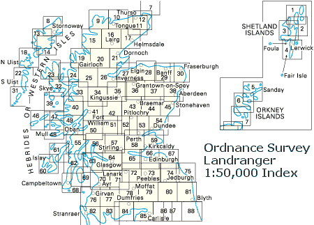 Ordnance Survey 1:50,000 Landranger maps cover the whole country in 40km or 25ml squares. They are ideal for touring, and detailed enough for walking. A pictorial index of the Scottish Landranger Maps is shown above.