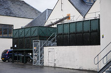 At Glenmorangie the tube condensers are placed close to the walls of the still room and attract little attention from the passing groups of visitors inevitably more fixated on the stills themselves. At other distilleries the condensers are placed outside: while at Bowmore one of two spirit condensers is inside the still room and the other one in the yard outside.