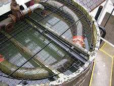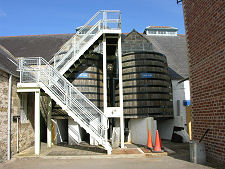 Condensers come either as tubes or worms. The worm condenser comprises a coil of copper tubing immersed in a large (usually, but not always) circular tank of water, usually raised above ground level. A good example of this is at Dalwhinnie Distillery, where the large worms, often mistaken for water tanks, sit outside the front of the distillery. The vapours enter at the top of the coil and the condensed liquid emerges at the bottom. At Cragganmore Distillery the water tanks housing the worms are square in shape and found at the rear of the distillery. At Oban Distillery the worm condensers are housed in the roof of the distillery.