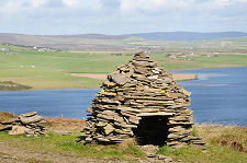 The Cuween Hill Chambered Cairn can be found on the flank of Cuween Hill, half a mile south-east of the centre of the village of Finstown on Orkney's West Mainland. You reach it from Old Finstown Road, which leaves the A965 in the village. From the road a track lead a few hundred yards to a small parking area, from where it is a walk of a few hundred yards more up the hill to the cairn.