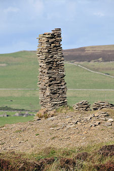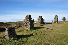 The track continues past the cairn to the top of the hill, where on our visit we encountered a series of - presumably modern - stacks of stones formed into columns and, in one case, a small shelter. Someone went to a lot of effort to construct these here: we've not been able to find out why or exactly when.