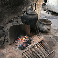 This is set against a short length of low wall. There is no chimney. The smoke from the peat it burns simply rises into the roof space and out through a hole or "lum" left for the purpose. The lum is not directly above the fire, to prevent falling rain dampening it. Ventilation is assisted by a wooden funnel in the roof space. In terms of technological advances, this system seems to be one step forward from the system used in a traditional blackhouse, in which smoke from a peat fire burning in the centre of the floor finds its own way out through a turf roof. Having said that, it still ensures that the house and everything in it reeks of peat smoke after a fairly brief exposure. It's a smell that, once experienced, is never forgotten. Above the fire at Kirbuster are a row of hanging fish, being smoked. If it's a sunny day, the effect of light from the rooflights beaming through the smoke can be quite enchanting.