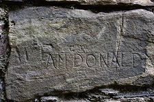 The standing parts of the tower form a shell with evidence visible of places where at least one upper floor would have been supported. There's also some carved graffiti, one piece dated 1884. It seems that in those days you left your mark with a hammer and stone chisel.