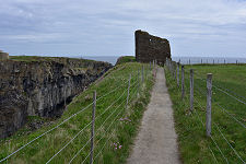 The castle is in view all the way from the parking area, but it is only once you pass the gate and guard post that you realise just how spectacular its location is. Until then the cliffs below the castle are hidden by the rising slope of the landscape. The total walk to the castle isn't much more than half a mile, and follows the near side of the northern geo before running around its landward end and approaching the castle from the west, passing what appear to be parts of the firing range en route. The final approach is along a path past an information board to the castle itself: and if you're at all scared of heights the spectacular location becomes more and more obvious the closer you get. (Continues below images...)